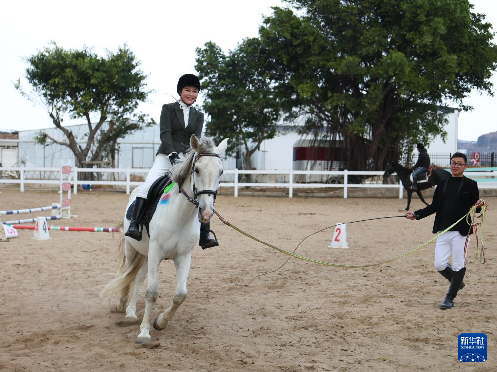 2月7日,在霞浦县宏昌工业文创基地跑马场,学员(左)在工作人员的协助下学习骑马。新华社记者 姜克红 摄
