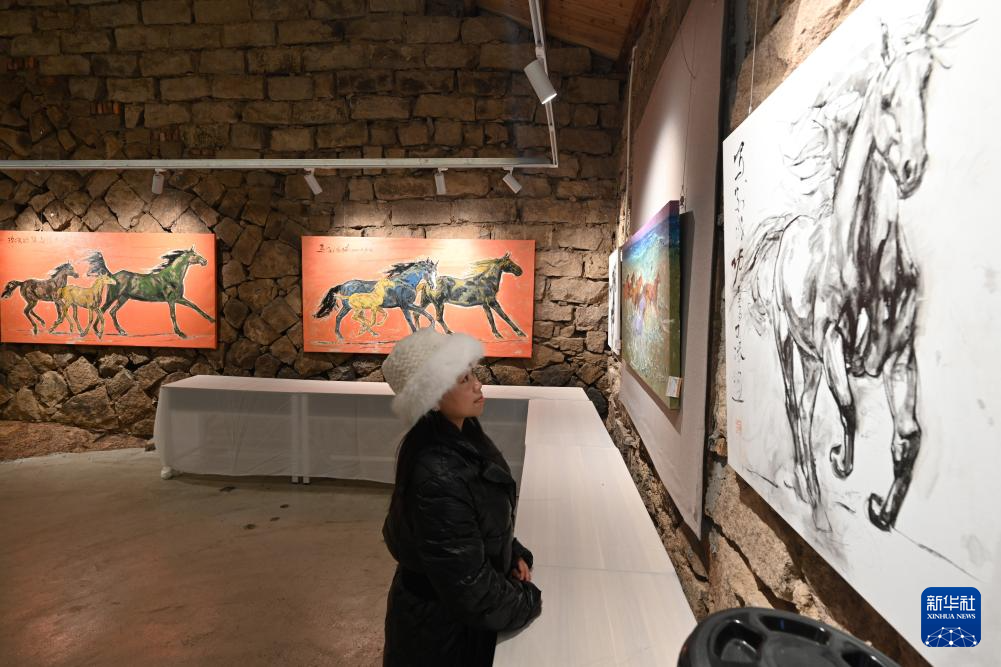 2月7日,游客在霞浦县宏昌工业文创基地观看马文化美术展。新华社记者 姜克红 摄