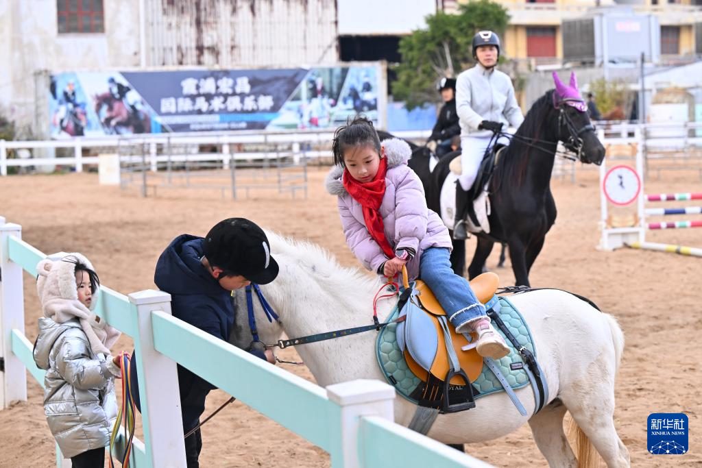 2月7日,在霞浦县宏昌工业文创基地跑马场,一名小女孩学习骑马。新华社记者 姜克红 摄