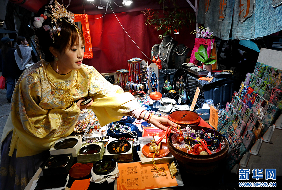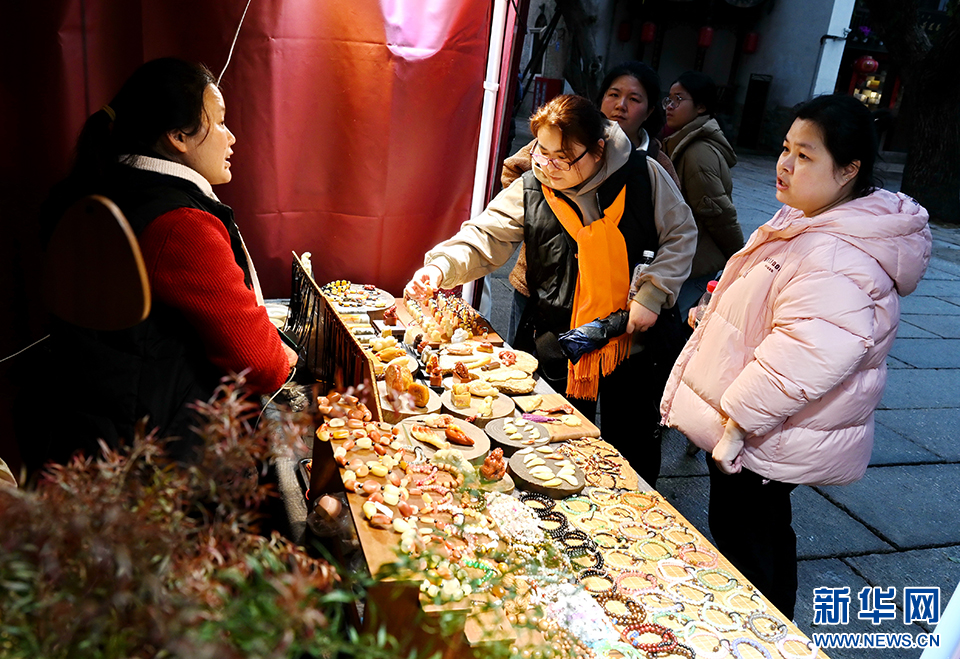2月11日,游客从福州上下杭历史文化街区的市集摊位前走过。新华社记者 林善传 摄