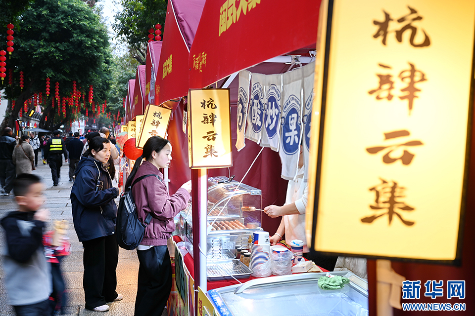 2月11日,游客在福州上下杭历史文化街区选购美食。新华社记者 林善传 摄
