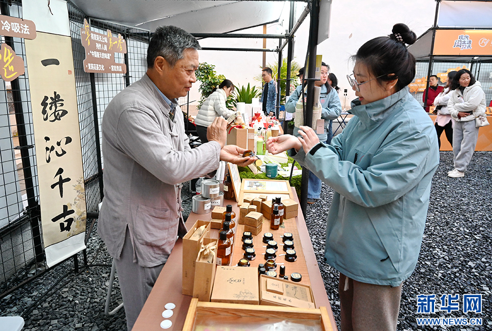 2月11日,福州市非物质文化遗产保护项目福州茉莉花膏古法制作技艺代表性传承人郭斌(左)在协助市民体验茉莉花膏香气。新华社记者 林善传 摄
