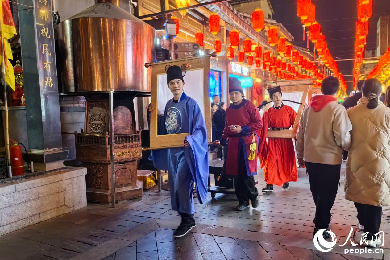 身着状元服饰的高跷艺人巡游古街,游客争相拍照。人民网记者 李昌乾摄