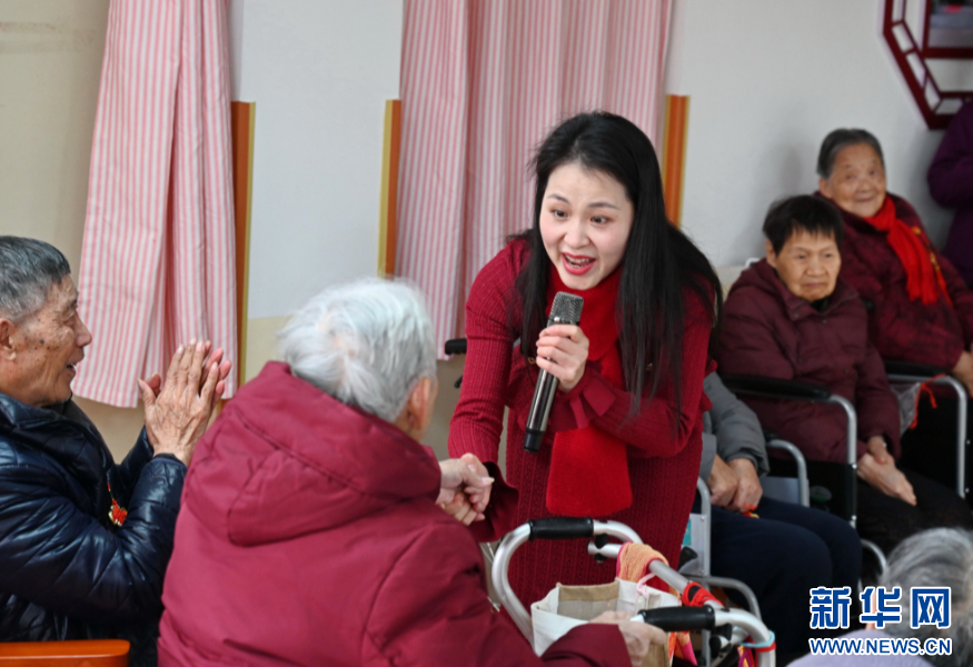 2月19日,福建省歌舞剧院歌剧团演员龚丹在福州市社会福利院为老人们演唱歌曲《山丹丹花开红艳艳》。新华社记者 林善传 摄