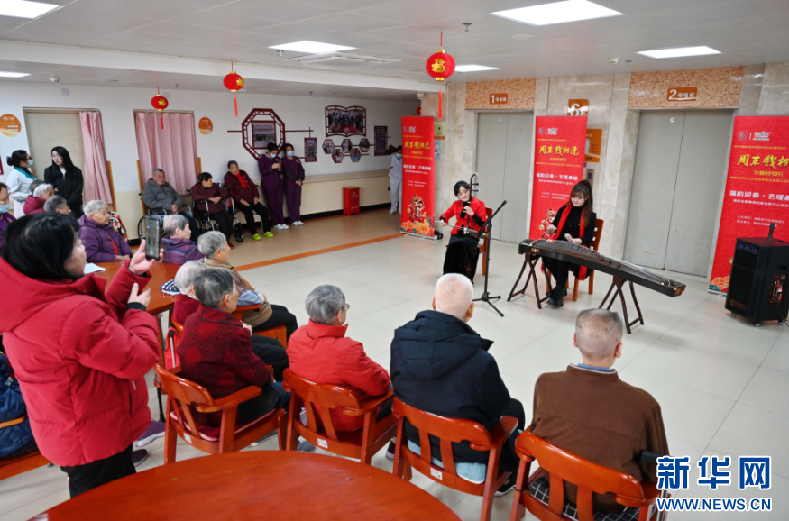 2月19日,福建省歌舞剧院民族乐团演奏员林敏(左)与谢杭雪在为福州市社会福利院老人演奏《喜洋洋》。新华社记者 林善传 摄