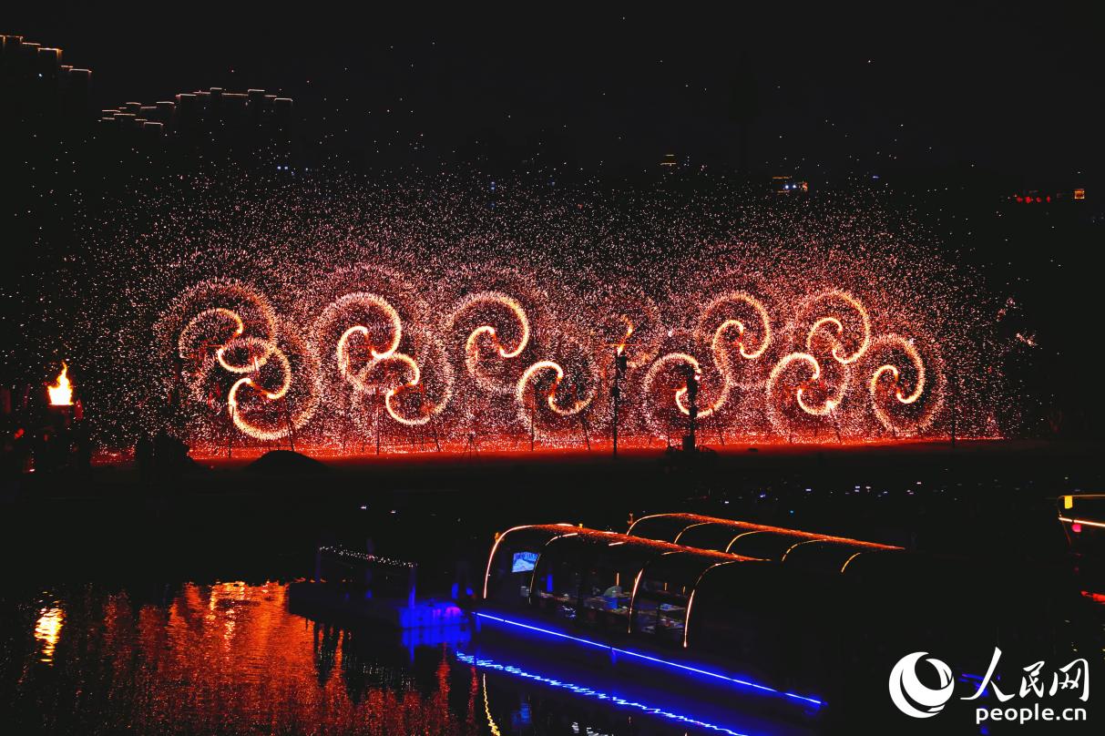 打铁花的光影在夜幕下灿烂辉煌。人民网记者 李唯一摄