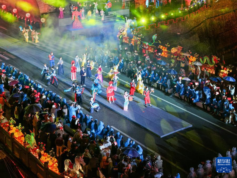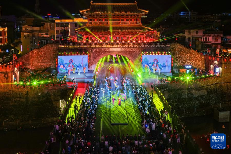 新华社福州2月28日电(记者周义)2月27日,夜幕下的福建长汀古城流光溢彩,济川门城楼前光影璀璨。随着灯光秀精彩上演,咏春拳招式在光影间呈现,拉开了长汀“非遗奇妙夜”序幕。