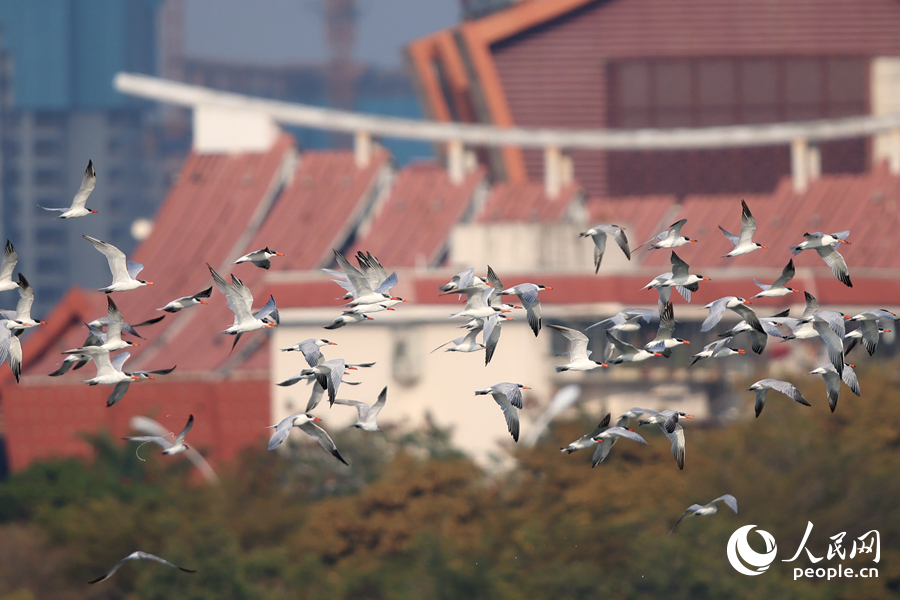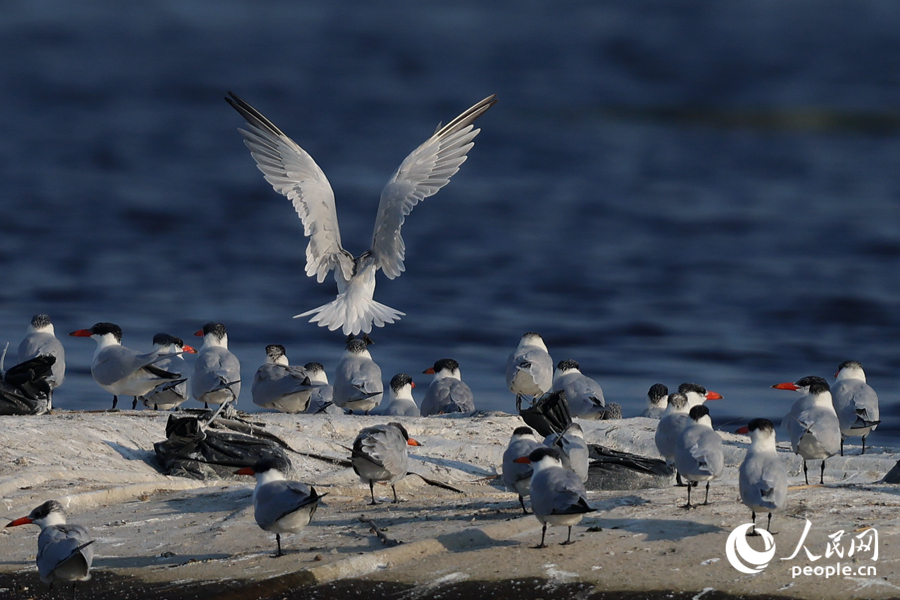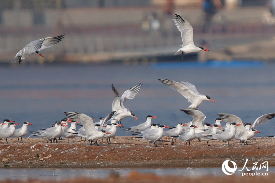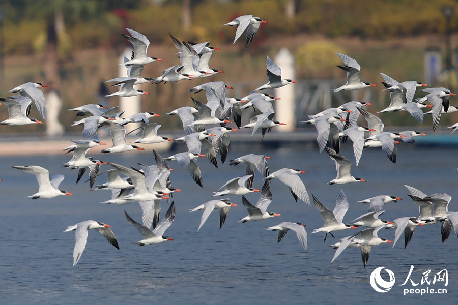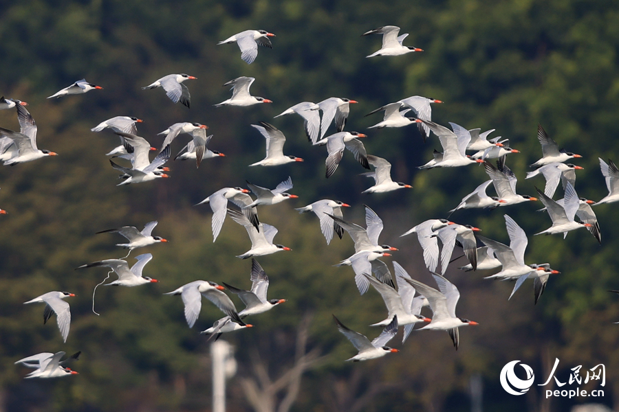 成群红嘴巨燕鸥现身集美杏林湾水域。人民网记者 陈博摄