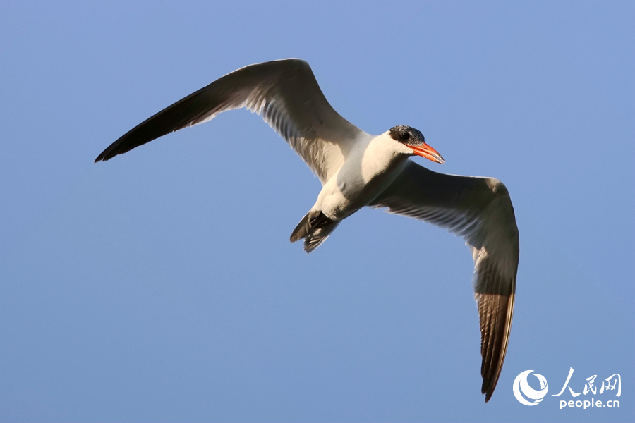 在空中飞行的红嘴巨燕鸥。人民网记者 陈博摄