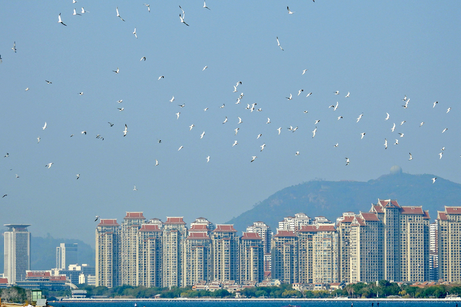 鸟群与杏林湾畔的嘉庚特色建筑相映成趣。人民网记者 陈博摄