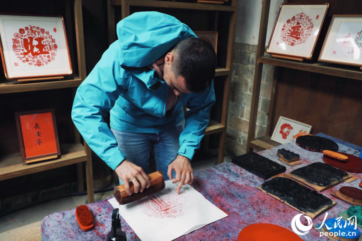 游客体验雕版印刷。人民网记者 李唯一摄