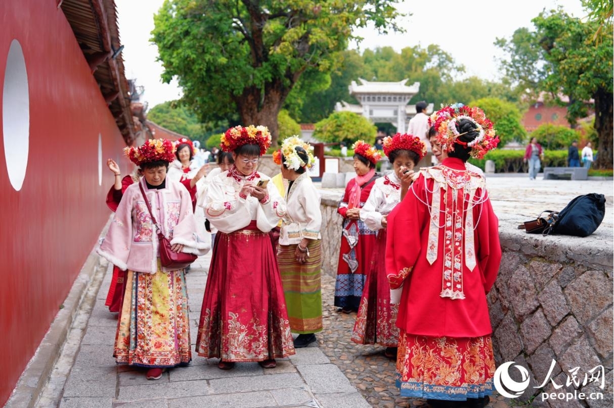 头戴簪花的游客在蟳埔村合影。人民网记者 李唯一摄