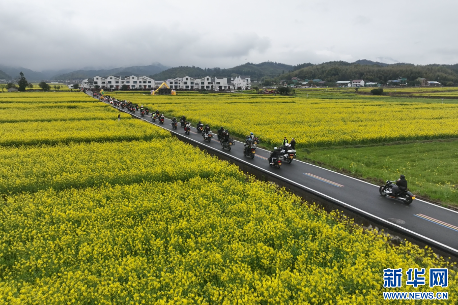 重型机车骑游队伍在油菜花海中前行。新华网发(叶彦曦 摄)