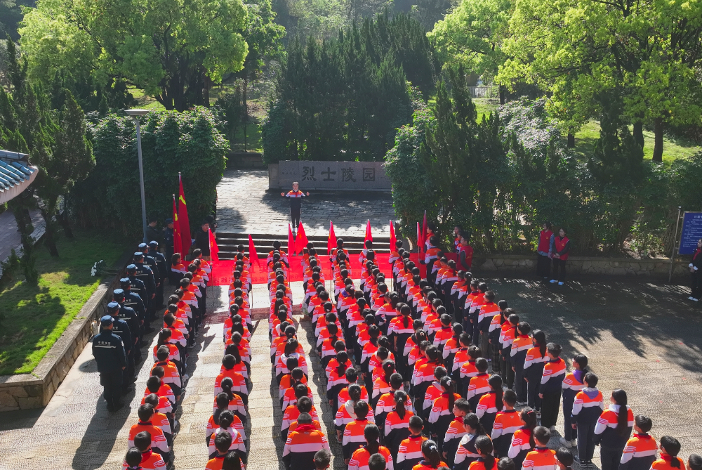 4月1日,福州海警局执法员携手福州市和平小学师生,徒步前往马尾区烈士陵园,开展共建祭奠活动。(王昊 摄)