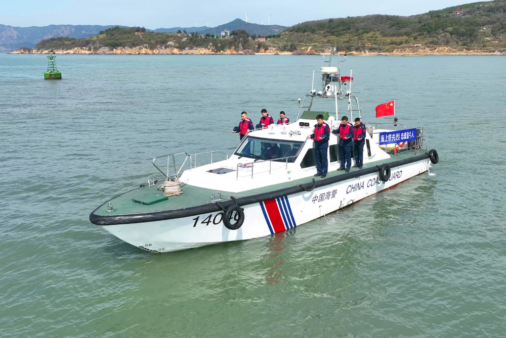 4月2日,福州海警局执法员登上执法艇,开展海上祭奠活动。新华网发(王昊 摄)