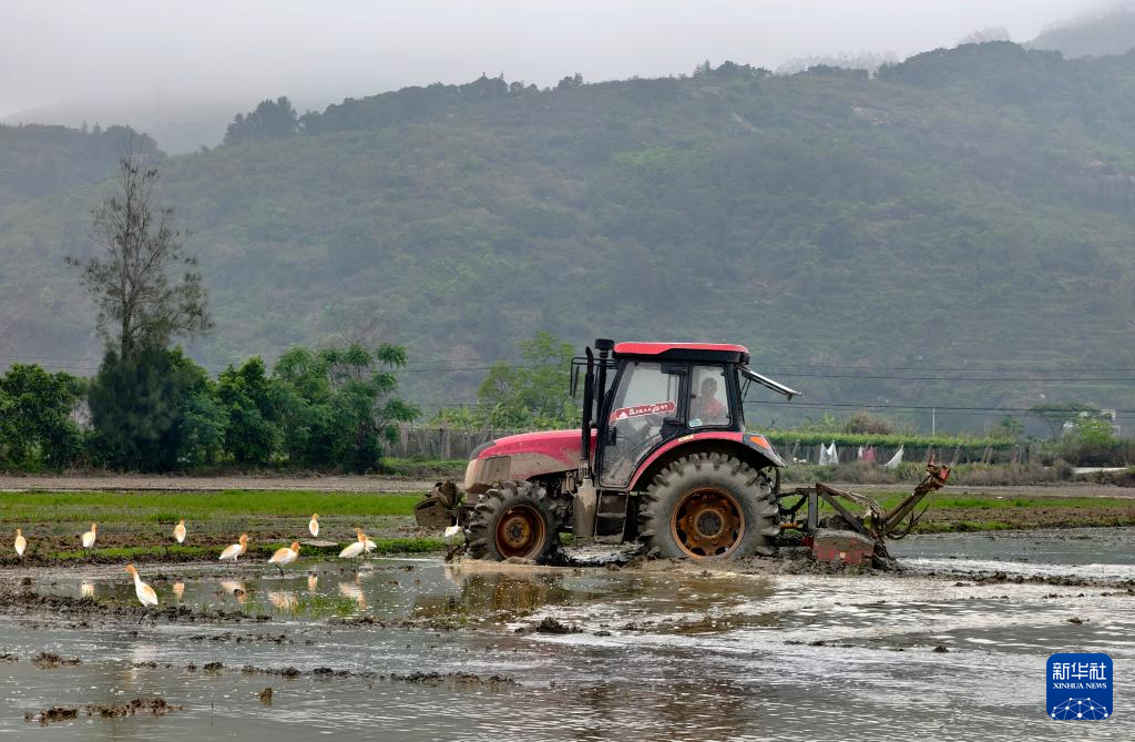 在福建省福州市连江县山堂村,工作人员驾驶犁地机在稻田里作业,为插秧做准备(4月22日摄)。新华社记者 魏培全 摄