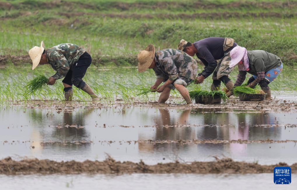 农户们在福建省福州市连江县山堂村稻田里栽插早稻秧苗(4月22日摄)。新华社记者 魏培全 摄