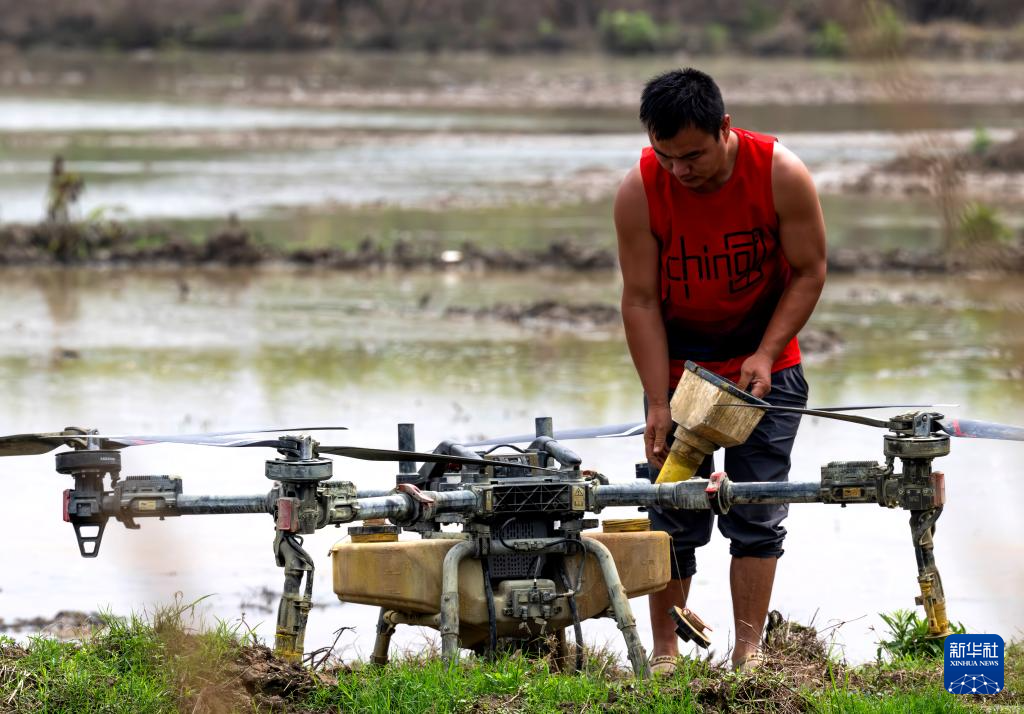 农业技术人员给农业无人机灌装肥料,准备开展稻田施肥作业(4月22日摄)。新华社记者 魏培全 摄