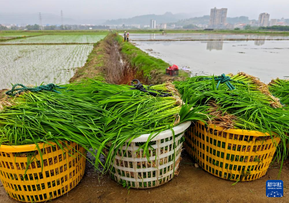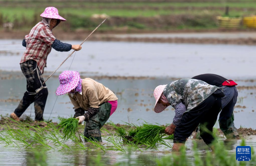 4月22日,农户在福建省福州市连江县山堂村稻田里栽插早稻秧苗。新华社记者 魏培全 摄