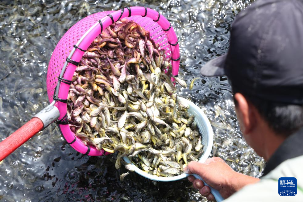 4月25日,在福建省宁德市霞浦县下浒镇海上养殖区,养殖户将大黄鱼鱼苗投放至渔排。新华社记者 姜克红 摄