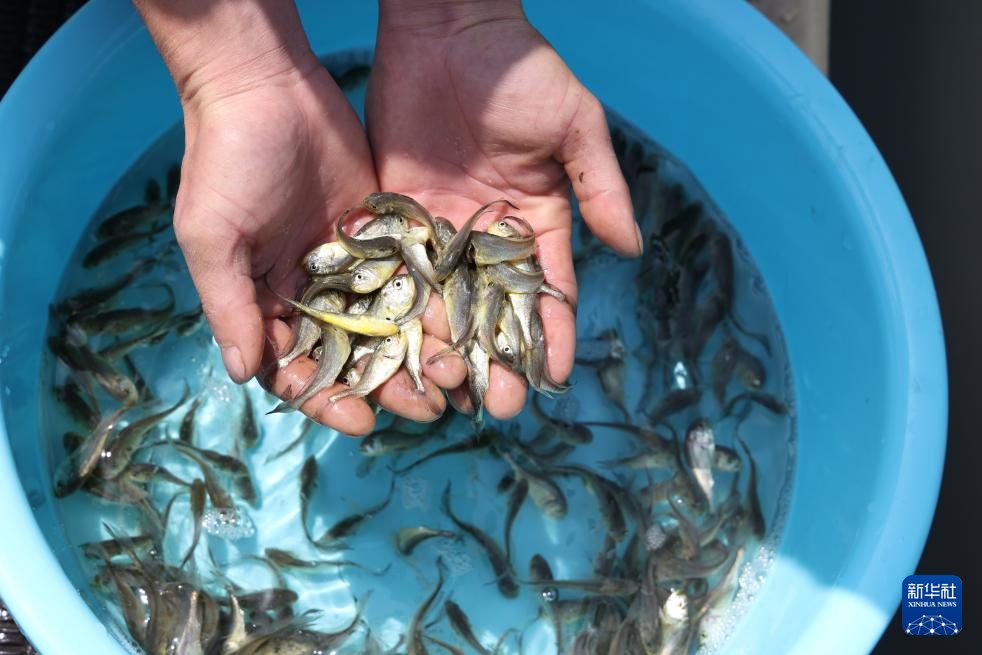 4月25日,在福建省宁德市三都澳海上养殖区,工人展示大黄鱼鱼苗。新华社记者 姜克红 摄