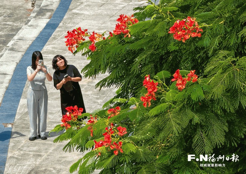 凤凰花遇见福州秋日蓝 专家:六月花九月开或和近期高温有关
