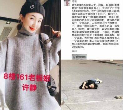 在2018年12月17日,在网上有人爆料称,说广州十三行的一个员工被自己的老板许静请了四个男子回来殴打,殴打之后女老板许静还把该男子从9楼扔了下来,导致了员工直接死亡。