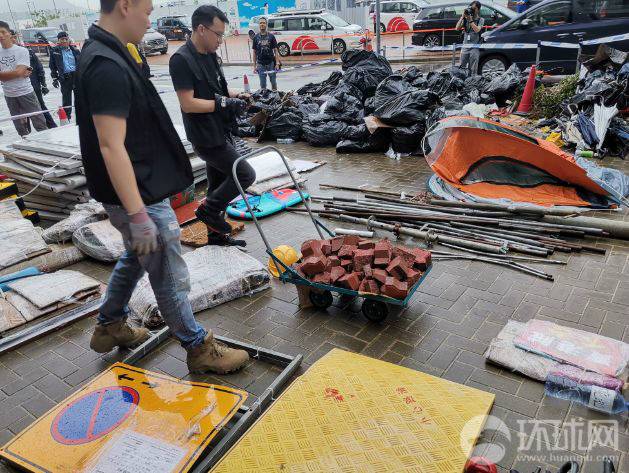 《环球时报》记者3日在立法会采访时,香港警察正在清理暴力示威者留下的杂物和作案工具,包括从附近工地拆卸的铁棍、脚手架、地砖和雨伞等。立法会工作人员告诉记者,警方取证工作已经完成。↓