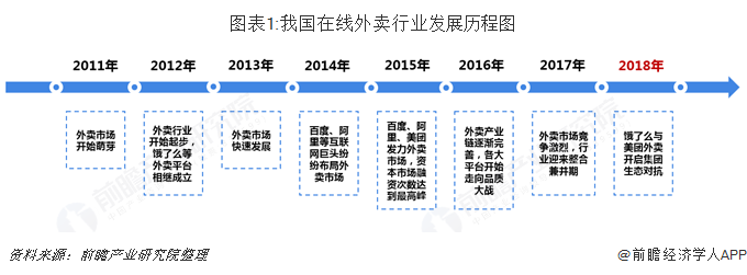 根据前瞻产业研究院分析,我国在线外卖市场于2011年开始萌芽,直到2012年行业才开始起步,饿了么、到家美食会等在线外卖平台相继成立,2013年迎来快速发展时期。发展到2017年,我国在线外卖市场迎来整合兼并期,8月,饿了么正式宣布合并百度外卖,市场形成以“饿了么+美团外卖”双雄角逐的格局,直到2018年,行业竞争格局几乎未发生改变,仍然是饿了么与美团外卖开启集团生态对抗,但这一年饿了么已经成为阿里系的一员,与此同时,美团点评或腾讯投资,成功在港交所上市。