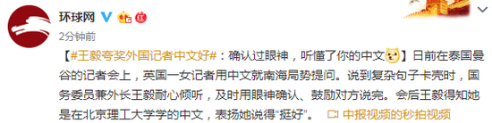 ]日前在泰国曼谷的记者会上,英国一女记者用中文就南海局势提问。说到复杂句子卡壳时,国务委员兼外长王毅耐心倾听,及时用眼神确认、鼓励对方说完。会后王毅得知她是在北京理工大学学的中文,表扬她说得“挺好”。