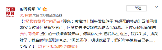 四川巴州26岁女教师何某坠楼身亡,何某丈夫接受媒体采访否认家暴。不过女教师闺蜜向@时间视频 提供的一段语音聊天中,何某称丈夫“把我按在地上,踩我头发、掐我脖子,我当时有想死的冲动。”何某还称,明明他错了,把所有事情赖自己身上,受够了!