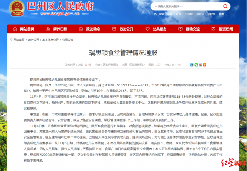 通报称,瑞思顿幼儿园是一所民办幼儿园,法人代表苟海,于2017年3月由成都东成西就教育科技有限责任公司举办。该园位于巴中市巴州区后河路6号,现有幼儿班10个,在园幼儿219人、职工52人。11月4日,巴州区市场监督管理局接群众举报,瑞思顿幼儿园食堂存在食物霉变、不洁问题。巴州区市场监督管理局11时58分赶赴现场,对群众举报的食品原料封存留样。晚9时许,在家长代表的见证下送检,承检单位为重庆海关技术中心。区教科体局派员到现场听取并收集学生家长的诉求、建议和意见。
