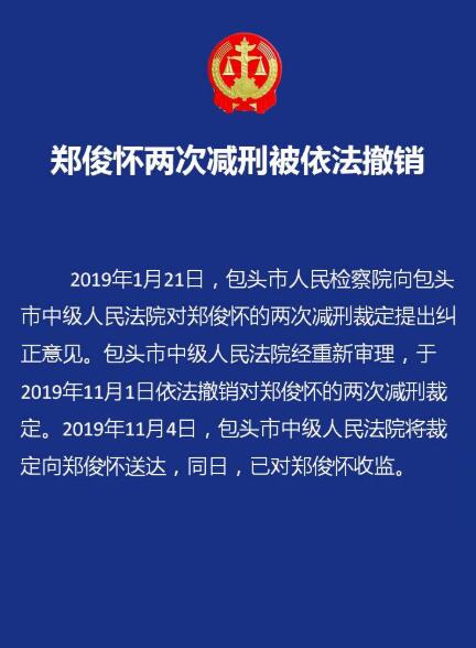 中国经济周刊—经济网讯 据包头市中级人民法院官网消息,包头市中级人民法院经重新审理,于2019年11月1日依法撤销对伊利前董事长郑俊怀的两次减刑裁定。2019年11月4日,包头市中级人民法院向郑俊怀送达裁定,同日,已对郑俊怀收监。