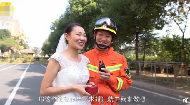 因为消防工作的特殊性,小两口异地恋两年,为了给对方一个长长久久的承诺,董杰特地准备了一个惊喜——分期60年买了一枚钻戒。