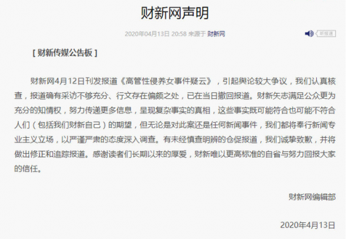 财新网4月12日刊发报道《高管性侵养女事件疑云》,引起舆论较大争议,我们认真核查,报道确有采访不够充分、行文存在偏颇之处,已在当日撤回报道。财新矢志满足公众更为充分的知情权,努力传递更多信息,呈现复杂事实的真相,这些事实既可能符合也可能不符合人们(包括我们财新自己)的期望,但无论是对此案还是任何新闻事件,我们都将奉行新闻专业主义立场,以严谨严肃的态度深入调查。有未经慎查明辨的仓促报道,我们诚挚致歉,并将做出修正和追踪报道。感谢读者们长期以来的厚爱,财新唯以更高标准的自省与努力回报大家的信任。