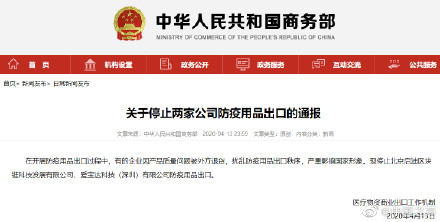 商务部停止两家公司防疫物品出口原因曝光 北京启迪和爱宝达科技有哪些问题