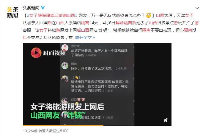 山西太原,天津女子从加拿大回国后在山西太原酒店隔离14天,4月5日解除隔离后她去了山西很多景点游玩并拍了游客照,该女子将旅游照发上网后山西网友“炸锅”,希望她继续自行隔离不要出去玩,担心隔离期后会变成无症状感染者,有的网友表示她去过的地方自己都不敢去了。