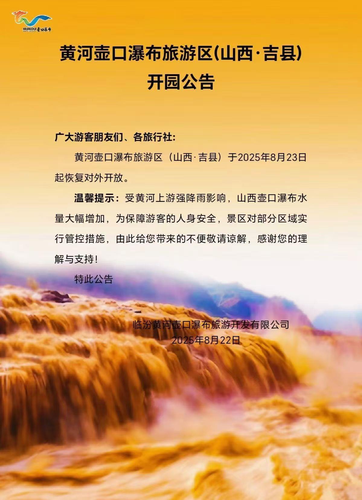 黄河壶口瀑布旅游区将于23日恢复对外开放
